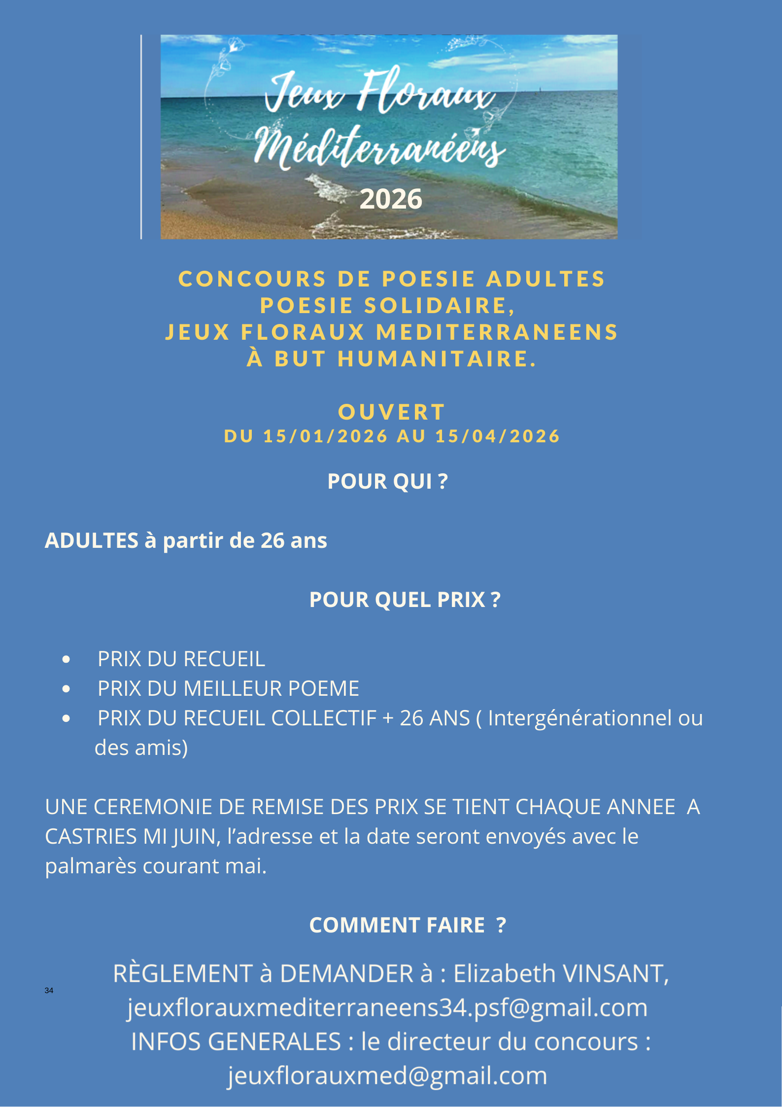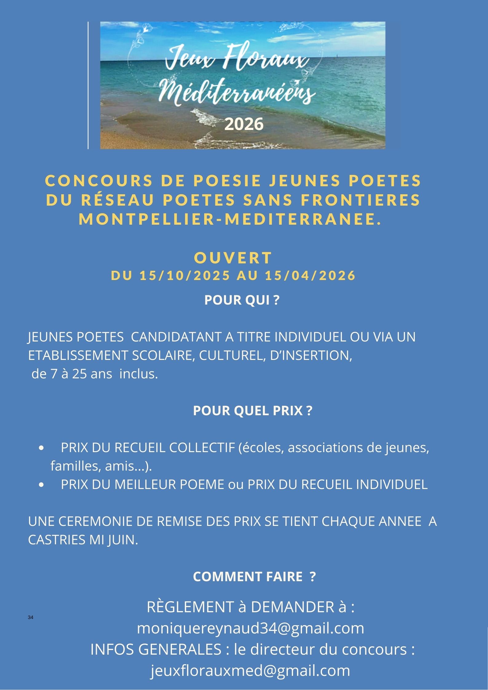 LES JEUX FLORAUX MEDITERRANEENS DE L'ASSOCIATION POESIE SOLIDAIRE a lancé son concours annuel JEUNES POETES de 7 à 25 ans inclus du 15/10/2025 au 15...