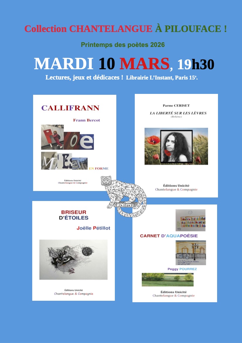 Frann Bercot, Joëlle Pétillot et Peggy Pourrez devraient présenter et dédicacer leurs ouvrages Callifrann, Briseur d’Etoiles et Carnet d’Aquapoésie, nous présenterons aussi l'ouvrage de Parme Ceriset La Liberté sur les lèvres (en extraordinaire coïncidence avec le thème 2026 du Printemps des Poètes) et on pourra se le procurer ainsi que les 3 autres.