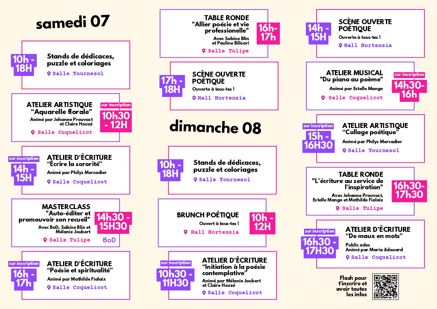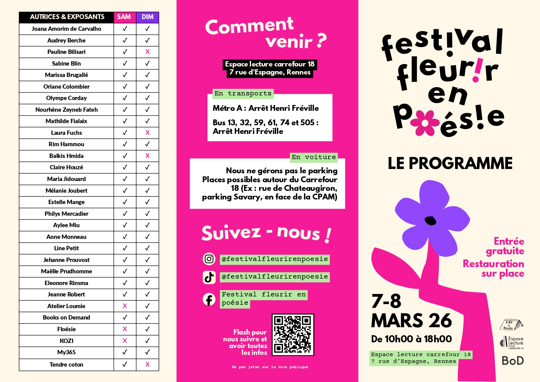 À l’occasion du Printemps des Poètes et de la Journée internationale des droits des femmes, l’Espace Lecture Carrefour 18 et l’association Lire et Délire proposent deux jours consacrés à une poésie vivante, actuelle et sensible, portée exclusivement par de jeunes poétesses, pour la plupart autoéditées, à travers le festival Fleurir en poésie. Ce rendez-vous met en lumière des écritures contemporaines et des démarches éditoriales indépendantes. Pendant tout le week-end, le public pourra rencontrer les autrices, découvrir leurs recueils, échanger autour des pratiques d’écriture et des chemins d’autoédition. Au programme : stands de dédicaces, petit marché de créatrices, rencontres, ateliers d’écriture (« Écrire la sororité », poésie contemplative, spiritualité, atelier ados « De maux en mots »), ateliers artistiques (aquarelle florale, collage poétique), atelier musical « Du piano au poème », masterclass autour de l’autoédition et de la promotion d’un recueil, tables rondes et scènes ouvertes ouvertes à toutes et tous. Petite restauration sur place. Accès métro A et bus, arrêt Henri Fréville.