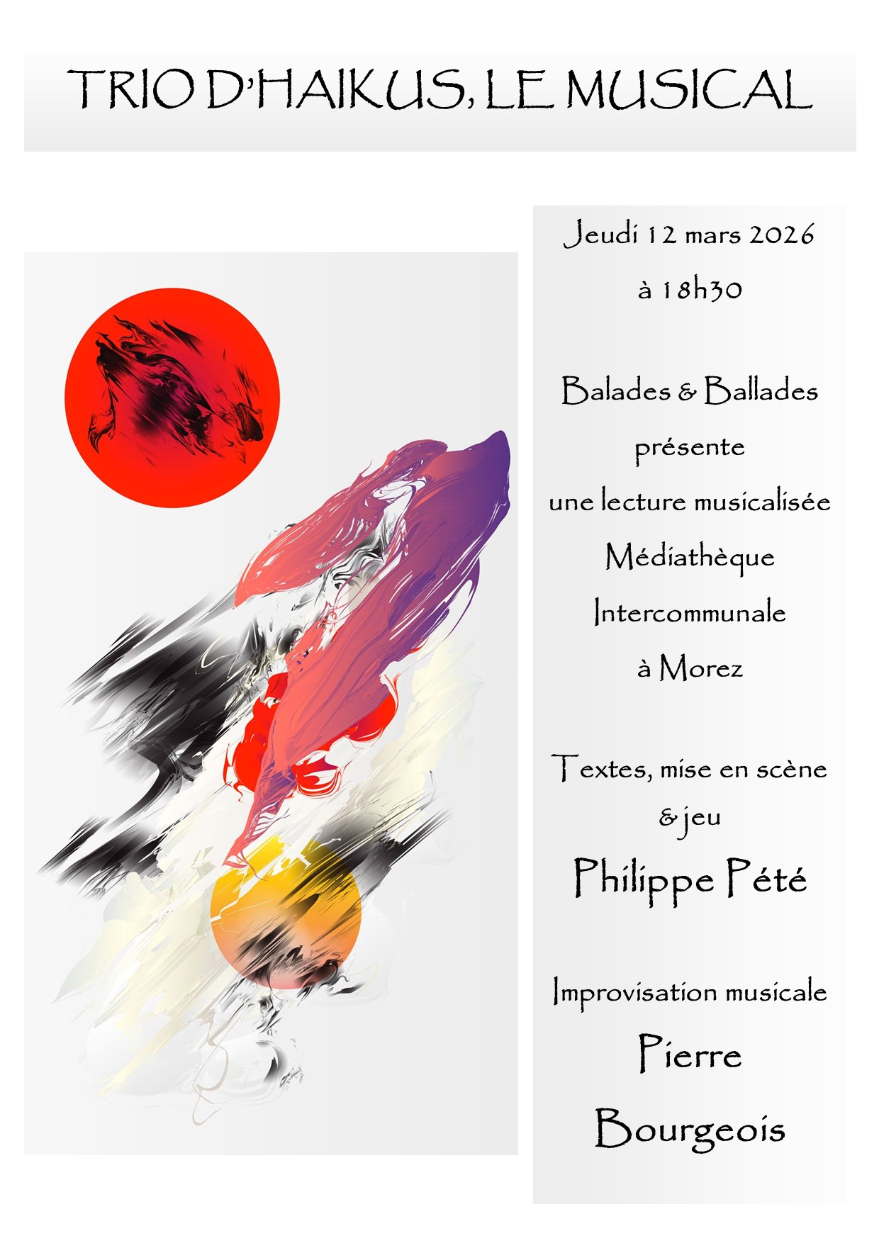 Trio d’haïkus, le musical. Haïkus de Philippe Pété, mis en musique par Pierre Bourgeois.