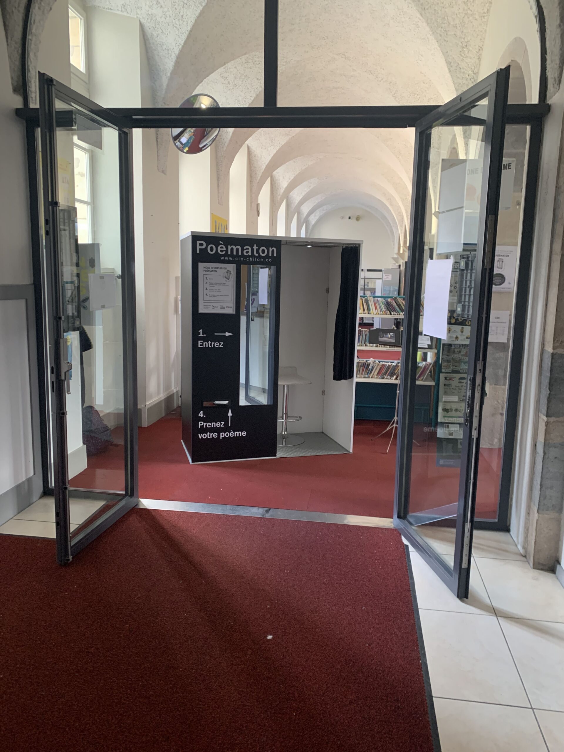 C’est une cabine inspirée du Photomaton® qui donne à écouter des poèmes sans voir celle qui les dit et sans être vu·e ni par la diseuse, ni par les autres depuis l’extérieur.
