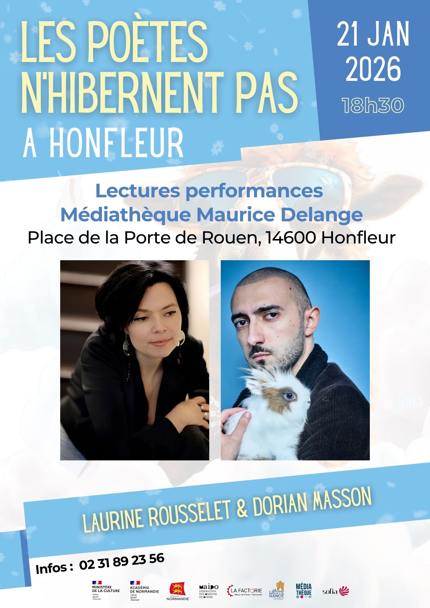 Rendez-vous le 21 janvier 2026 à la Médiathèque Maurice Delange de Honfleur pour une soirée performances et rencontres avec Laurine Rousselet et Dorian Masson.