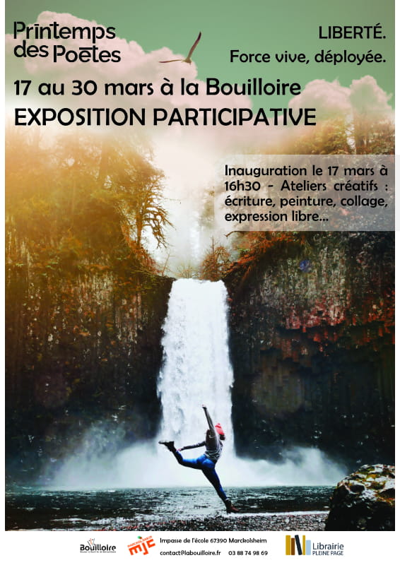 Le Printemps des poètes s'invite à Marckolsheim ! Du 16 au 30 mars, visitez notre exposition participative autour du thème "Liberté. Force vive, déployée". Nous vous attendons pour l'inauguration mardi 17 mars dès 16h30 au bar associatif de La Bouilloire, pour des ateliers d'expression libre en poésie (collage, peinture, écriture... Laissez parler votre créativité !)