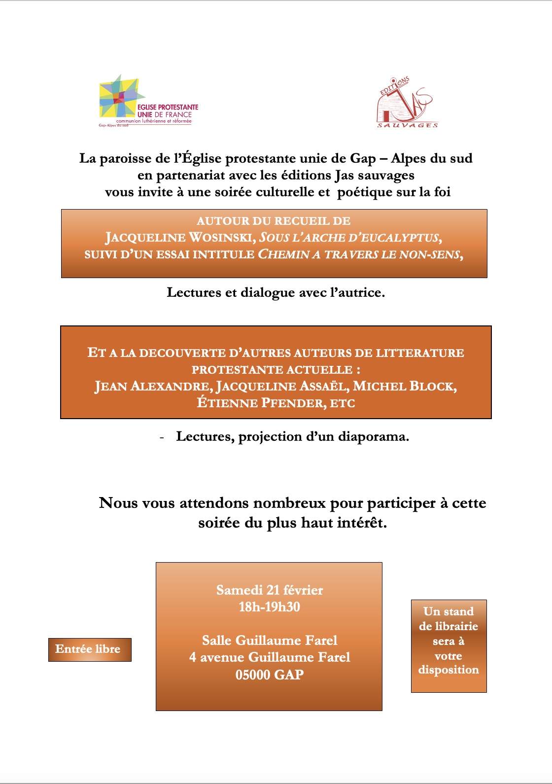 La paroisse de l’Église protestante unie de Gap – Alpes du sud en partenariat avec les éditions Jas sauvages vous invite à une soirée culturelle et poétique sur la foi autour du recueil de Jacqueline Wosinski, Sous l'arche d'eucalyptus, suivi d'un essai: Chemin à travers le non sens.