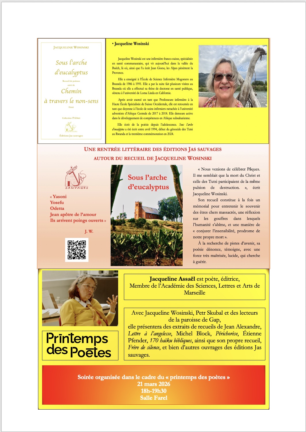 En effet, avec Jacqueline Wosinski, Petr Skubal et des lecteurs de la paroisse de Gap, Jacqueline Assaël présentera des extraits de recueils de Jean Alexandre, Lettre à l’angelesse, Michel Block, Périchorèse, Étienne Pfender, 170 haïku bibliques, ainsi que son propre recueil, Frère de silence, et bien d’autres ouvrages des éditions Jas sauvages.
