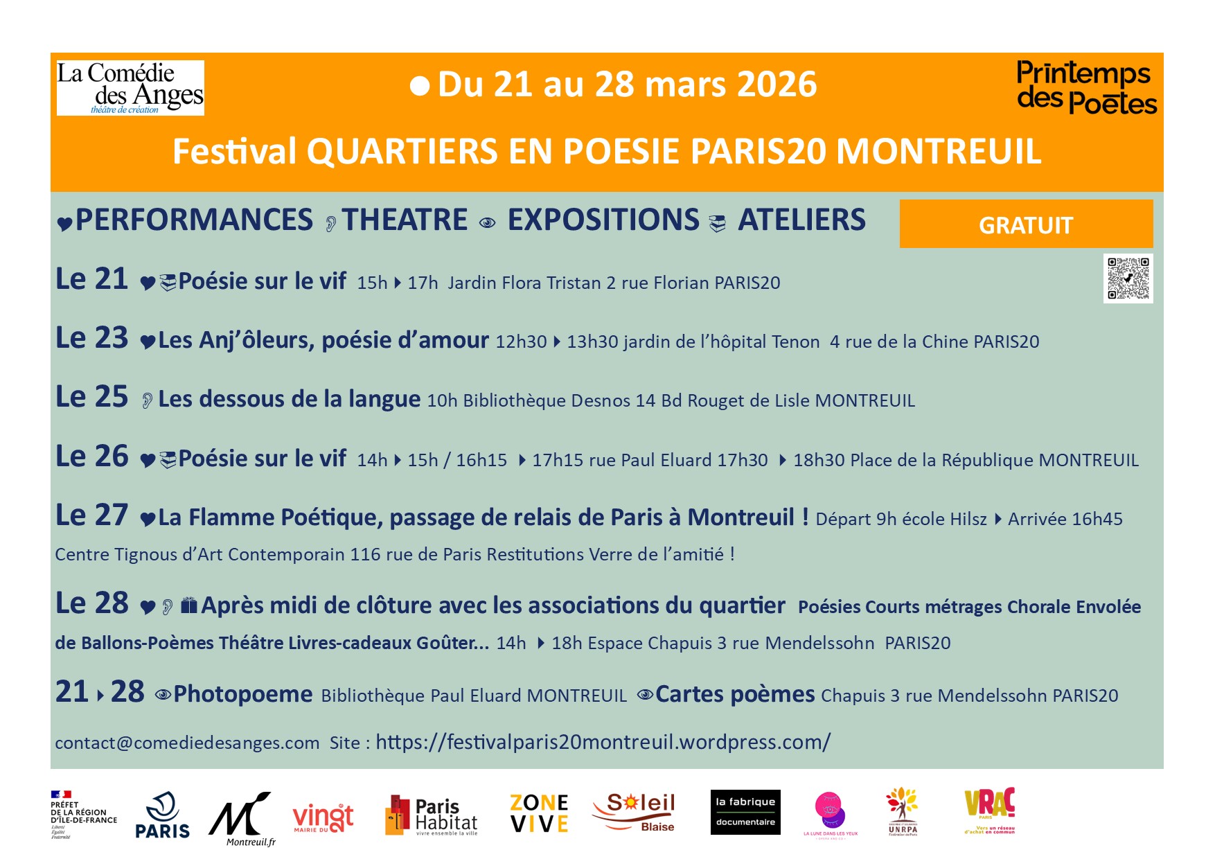 Le 28 mars Après midi de clôture avec les associations du quartier pour des temps de Poésies Courts métrages Chorale Envolée de Ballons-Poèmes Théâtre Livres-cadeaux Goûter... De 14h à 18h Espace Chapuis 3 rue Mendelssohn PARIS20