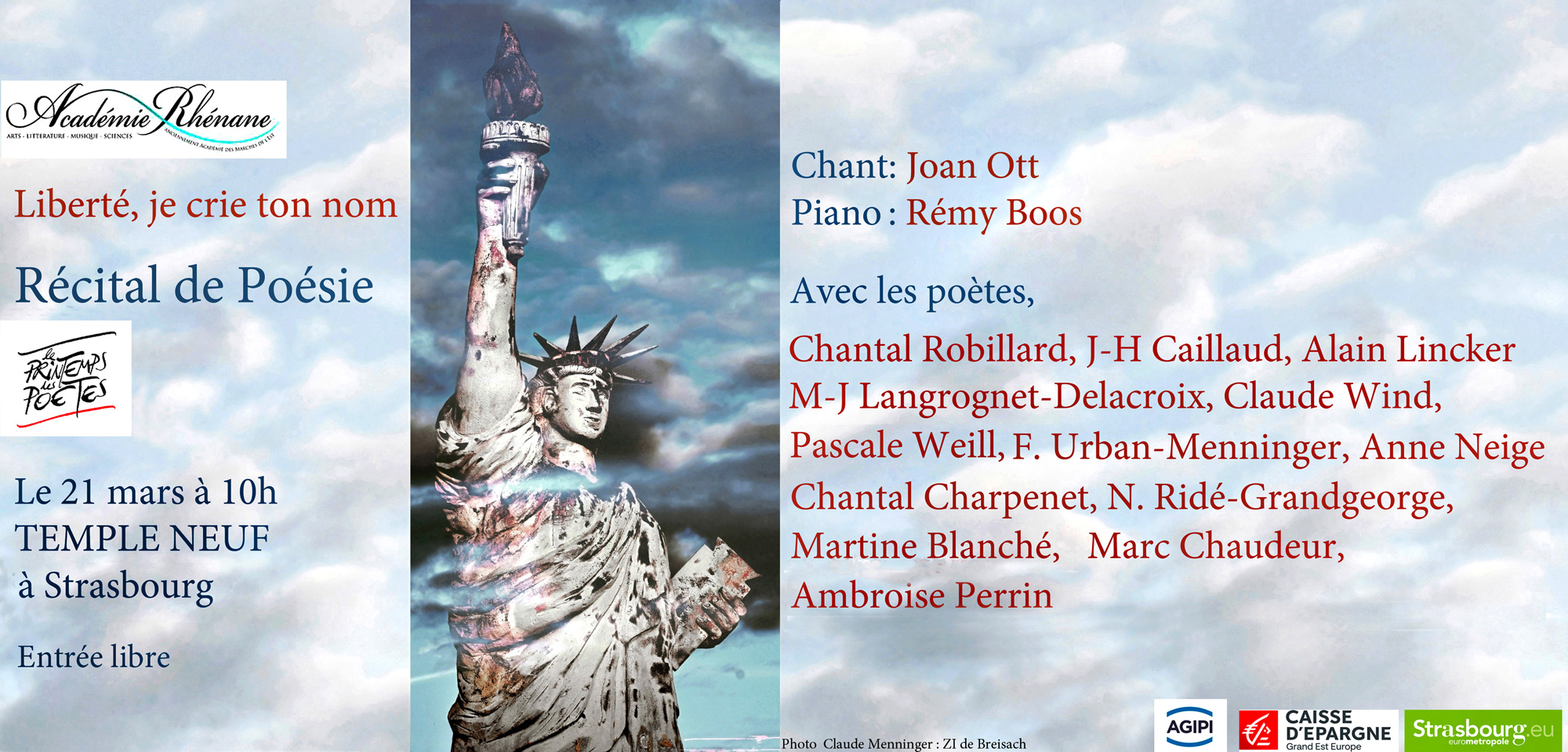 Plusieurs poètes de l'Académie rhénane liront leurs textes sur le thème "Liberté, je crie ton nom". Ils seront accompagnés au piano par Rémy Boos et par Joan Ott qui chantera ses chansons