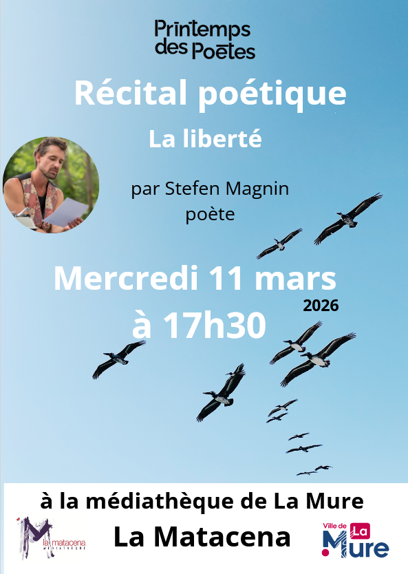 Pour le Printemps des Poètes, Stefen Magnin, poète local, viendra proposer à la Médiathèque de la Mure une heure de poésie à voix haute, autour du thème "Liberté, force vive déployée".  L'artiste-auteur nous présentera un récital composé entre autres de poèmes écrits de sa plume. Pour Stefen Magnin, "la poésie ne prétend à rien d’autre qu'à donner aux mots un écrin nouveau, aux oreilles un chant neuf, aux cœurs une rencontre avec eux-mêmes. Et si la graine attend le printemps pour commencer à germer, la poésie se moque des saisons. Mais le Printemps des Poètes vient lui offrir une fenêtre pour se faire entendre mieux, et nous rappeler cette évidence : regarder les fleurs et nos enfants pousser, sous un ciel de paix, c’est une liberté à défendre. Le poème est cette main qui tient l’oisillon dans sa main, suffisamment ronde pour le tenir au chaud, suffisamment ouverte pour le laisser libre de voler."